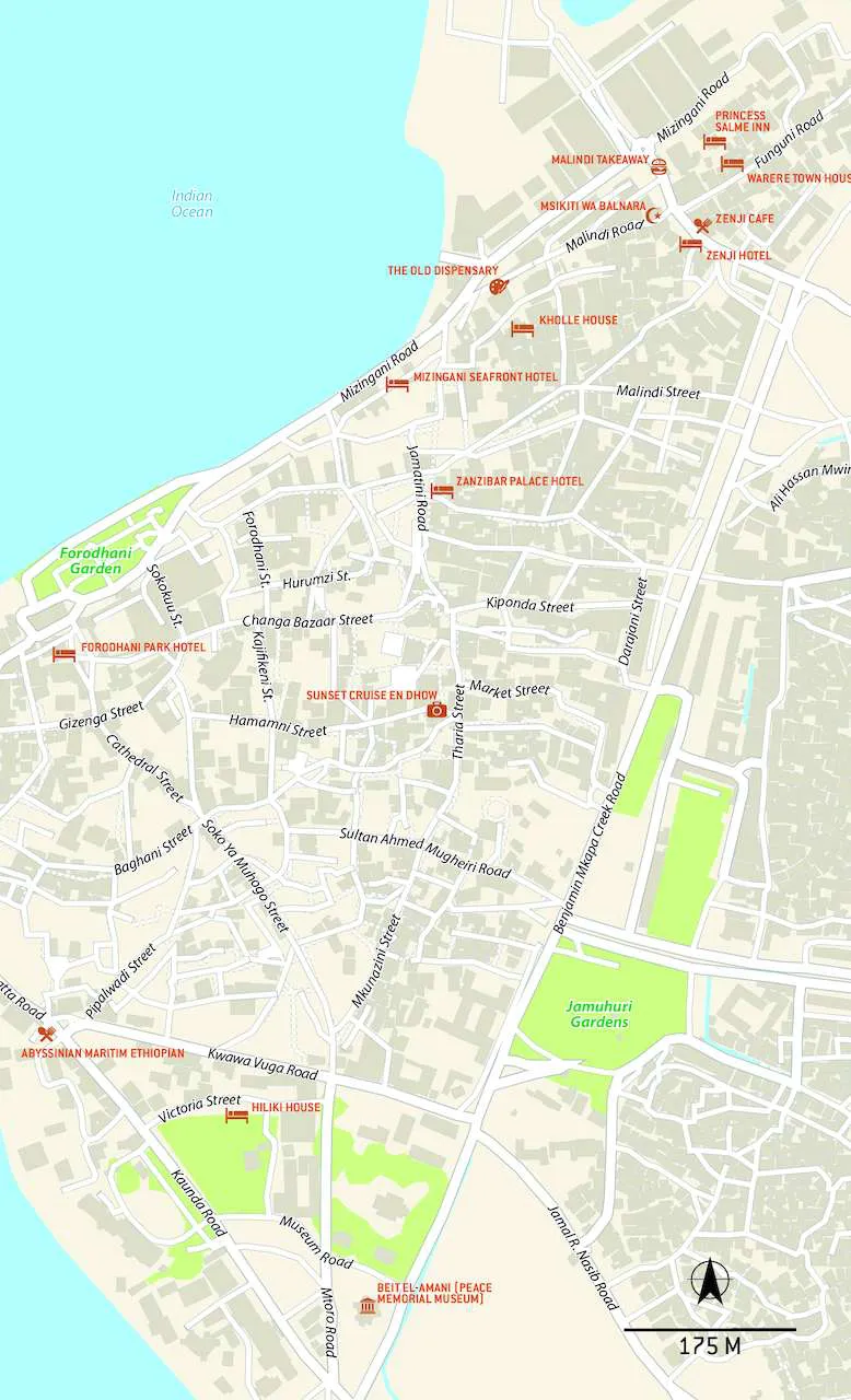 Pensez à réserver votre transfert de l'aéroport à Stone Town (voir Pratique). Une fois dans la vieille ville, vous n'aurez besoin que de vos pieds. Et d'un bon GPS car se repérer dans ces ruelles tortueuses est compliqué. Mais pas impossible ! Kenyatta Road est la route d'arrivée en voiture. Puis des ruelles principales quadrillent la vieille ville. Le front de mer est facilement repérable, principalement le vieux fort et les jardins de Forodhani, tout comme l'église anglicane. Le mieux est de prendre un guide local à la journée pour visiter les musées et la vieille ville sans passer le nez sur son téléphone en cherchant sa route et pour en apprendre un peu plus sur l'histoire de Stone Town. Des taxis et des bajajs (pour faire des petits trajets dans Stone Town) sont postés devant le Tembo Hotel plein centre. Attention aux heures de débarquement des bateaux au port de Malindi, il y a alors un bouchon pour sortir de la ville.