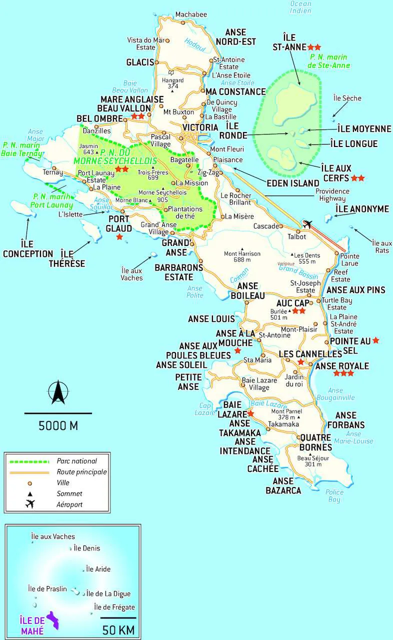 Vue du ciel, quel spectacle ! Mahé est une île de rêve et certains voyageurs, qui ne jurent que par Praslin ou La Digue, ont tort de la bouder. C’est la plus grande île de l’archipel, celle de la capitale Victoria et de l’aéroport international. Les vieilles demeures créoles sont disséminées dans l’épais manteau végétal de cette île-forêt. Dominée par le morne Seychellois qui trône à 906 m sur de luxuriantes collines, elle offre aussi un littoral d’exception, ourlé d’une frange de sable blanc, avec des dizaines d’anses qui constituent près de soixante-dix criques à grand spectacle. De la populaire plage de Beau Vallon aux paisibles banc de sable de la côte est, en passant par les criques et plages paradisiaques de la côte ouest, Mahé recèle des trésors balnéaires.