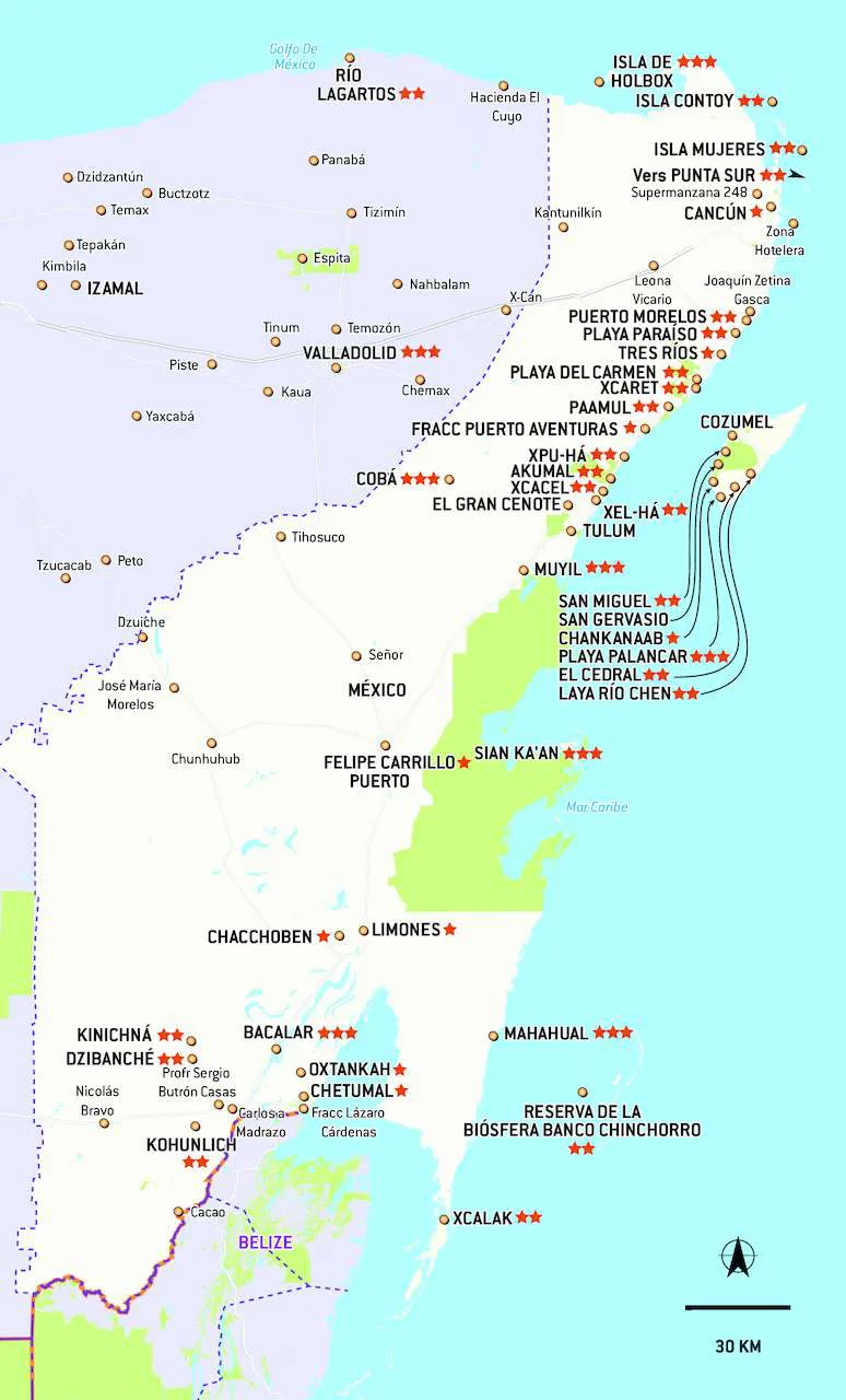 Le Quintana Roo est l'État le plus touristique du Mexique, dont Cancún donne une image souvent trompeuse. Beaucoup de voyageurs préfèrent éviter cette station balnéaire ultra touristique pour descendre directement vers Playa del Carmen ou Tulum. La Riviera Maya qui longe la côte caraïbe offre mille et une activités et des sites exceptionnels. On pense à ses plages de rêves, le site maya de Cobá, la réserve de biosphère de Sian Ka'an, aux cenotes plus étonnants les uns que les autres, ou à Cozumel pour des plongées de classe mondiale. Au nord, Isla Mujeres, Isla Holbox et Isla Contoy ont chacune une identité propre. Enfin, plus au sud, c'est la Costa Maya, encore épargnée du tourisme de masse, avec ses paisibles villages de pêcheurs, et encore des vestiges mayas et sites naturels magnifiques, comme la lagune de Bacalar. Facile à explorer, la région combine donc parfaitement tourisme balnéaire, écotourisme et découverte du monde maya.