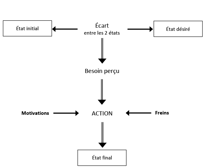 Le processus qui le mĂšne Ă cette action peut se rĂ©sumer de la maniĂšre suivante : lâindividu constate un Ă©cart entre sa situation actuelle (Ă©tat initial) et la situation souhaitĂ©e (Ă©tat dĂ©sirĂ©) ; lâindividu prend Ă ce moment conscience dâun besoin.