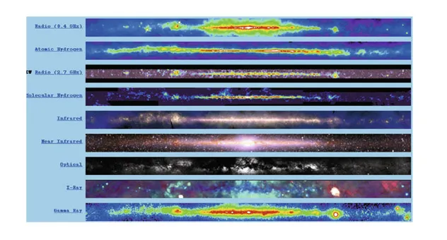 Figure 1 – La Voie lactée, notre galaxie, vue à différentes longueurs d’onde, chacune révélant des objets et des phénomènes différents.