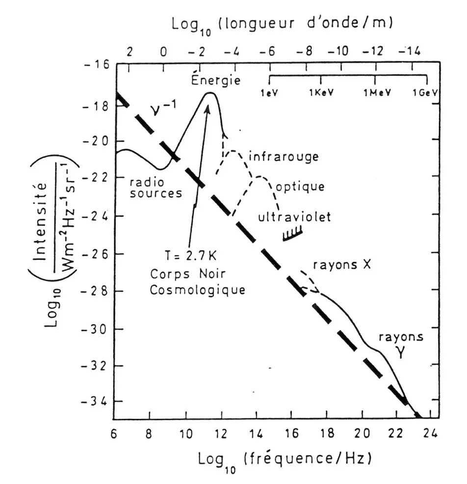 Figure 2 – La distribution du rayonnement émis par l’Univers suivant les longueurs d’onde ; la bosse principale correspond au corps noir cosmologique ; le pointillé c...