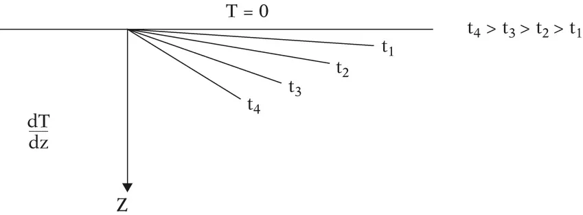 Pour de petites valeurs du temps la valeur du gradient géothermique (dT/dx) va être extrêmement élevée, puis va décroître à mesure que la couche refroidie par diffusion de la chaleur de l’intérieur vers la surface libre augmente d’épaisseur (Fig. 2).