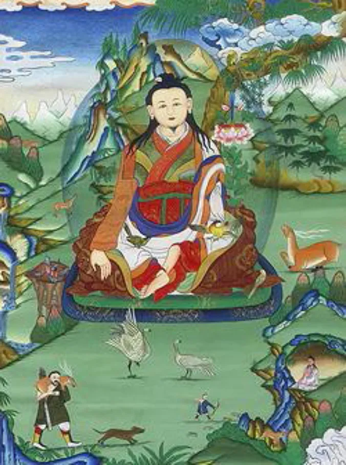 Chaque fois que je pose mes yeux sur la tangka représentant Jigmé Lingpa en posture de méditation au sein d’une luxuriante nature himalayenne et entouré d’une faune paisible - biche, cerf, héron viendraient manger dans sa main presque - je suis rappelée au souvenir de Tulku Tashi Rinpoché qui lui ressemble.