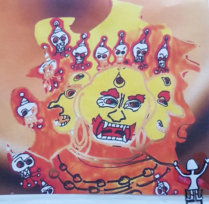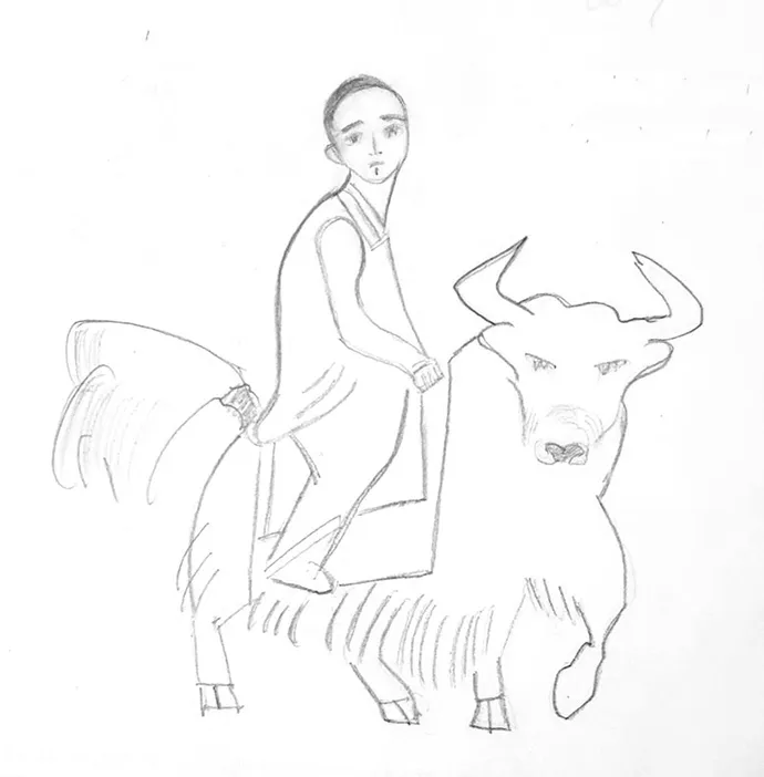 Tulku Tashi. Un ovale parfait de front en demi-lune. Expression paisible du visage. Le cerf qui l’accompagne pourrait être un.e. de ses disciples. Et les ondes vertes qu’ils émettent au niveau du chakra de la gorge pourraient symboliser leur communication sur... Whatsapp ou WeChat.