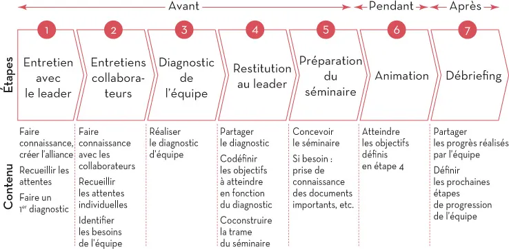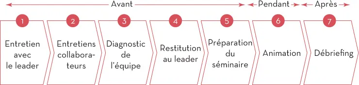 | Étape 4 | 2 h | Partager le diagnostic avec le leader. Coconstruire le séminaire avec lui. | Autant les entretiens doivent être menés de façon confidentielle et être restitués au leader de façon anonyme, autant il est important de lui restituer votre vision de son équipe, d’une façon qui soit audible pour lui. C’est là que le coaching d’équipe rejoint le coaching individuel, même si ce dernier n’est pas nommé explicitement. C’est l’ensemble du système qu’il convient d’accompagner dans sa croissance. |