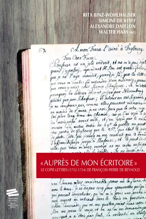 Le Fribourgeois François Pierre de Reynold (1709-1759) a laissé un document majeur pour l'étude d'un microcosme social sous l'Ancien Régime: quatre cahiers, dans lesquels il consigne l'essentiel de sa correspondance active entre 1732 et 1754. La variété de ces lettres, tant par les sujets qu'elles abordent que par la gamme contrastée de leurs destinataires, propose un témoignage exceptionnel de la vie quotidienne, mais aussi de l'organisation politique, des rapports sociaux et des conditions économiques qui régissent Fribourg au mitan du xv???e siècle, avec, en toile de fond, les échos de l'histoire européenne. Rédigées en majorité en français, mais aussi en allemand (64 lettres), avec quelques incursions vers l'italien, voire le latin, ces lettres sont également un reflet précieux des mécanismes subtils associés à une culture bilingue. Elles témoignent de la prééminence du français comme langue de la "bonne société", mais soulignent de plus l'importance de l'allemand, langue officielle du régime patricien. L'attirance manifeste de l'épistolier pour la culture française ne contredit en rien son sentiment d'appartenance à un univers distinct: en enregistrant la modeste production des heures passées "auprès de son écritoire", il annonce la prise de conscience identitaire qui se généralisera à la fin du siècle.