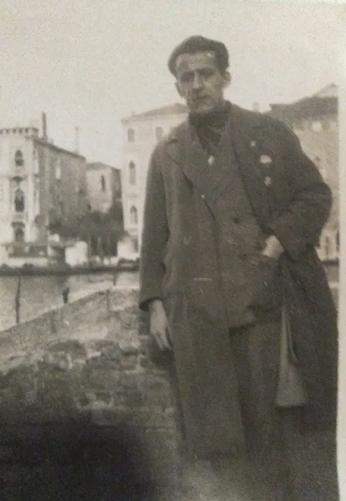 È realmente appoggiato al ponte che dalla pescheria di Rialto va nella Fondamenta Riva Olio, alle spalle il Canal Grande e nella riva opposta s’intravede l’imbarcadero del vaporetto della Ca’ d’Oro e l’angolo del palazzo. L’abbigliamento denota quell’eleganza sbrigativa che ricordo: ha un dolcevita scuro, una giacca doppiopetto e sopra ancora un cappotto aperto, la mano sinistra è infilata nella tasca della giacca, questa sì quasi una posa, l’altra scivola sul fianco destro, la scorgo sottile, il polso fine, giovanile. In quel febbraio del 1929 arriverà il grande gelo, sarà a memoria per sempre “l’anno del giasso”, la laguna di Venezia ghiaccerà completamente ma in quell’anno cruciale arriverà anche una crisi economica epocale e allora pare che il suo volto seppur giovane, sia già un po’ segnato.