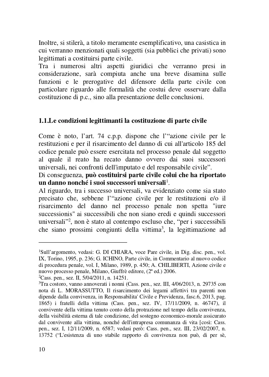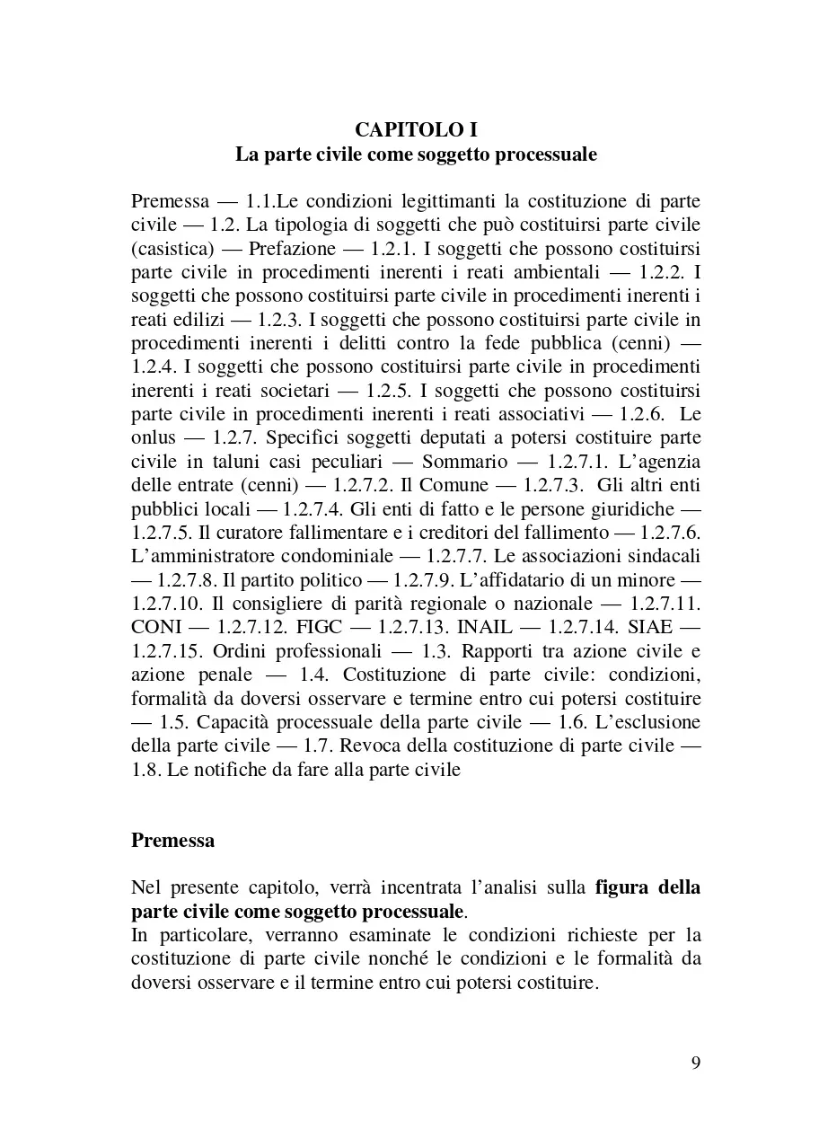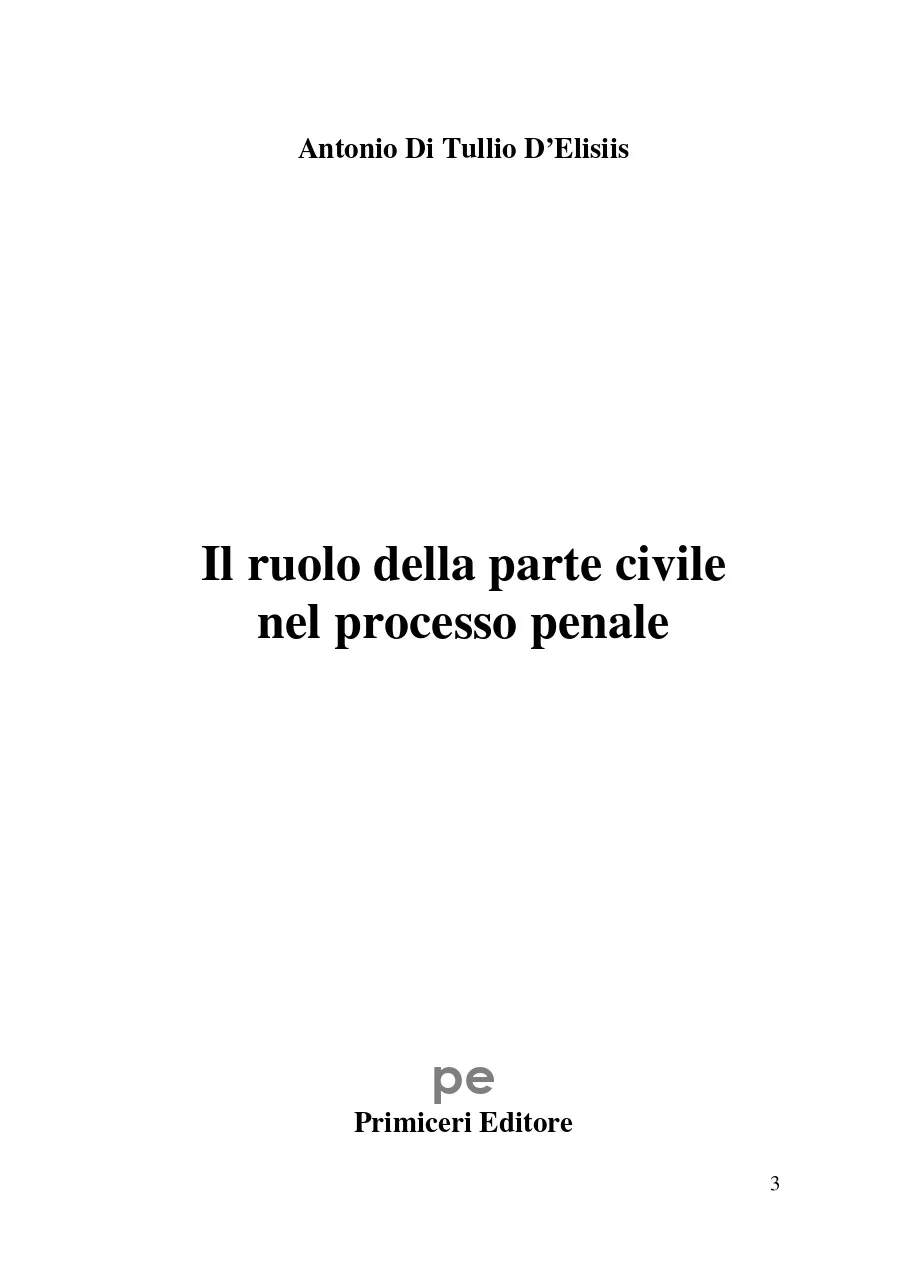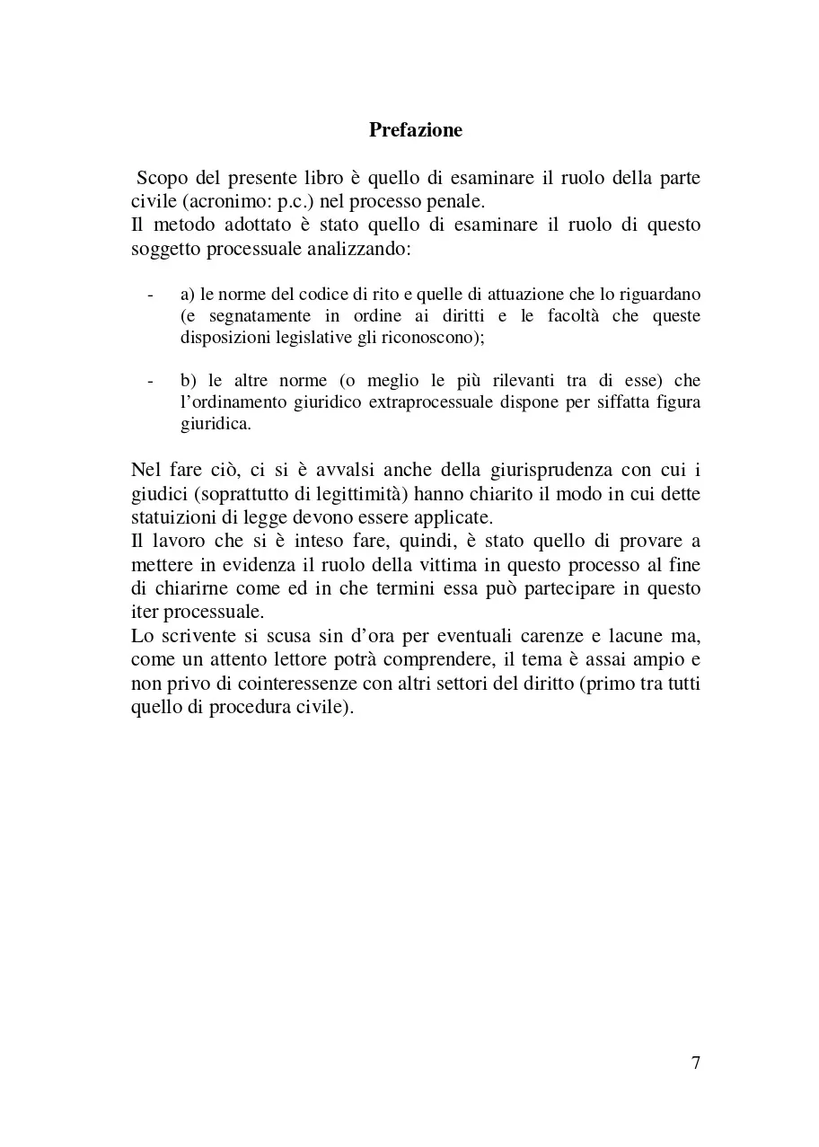 Scopo del presente libro è quello di esaminare il ruolo della parte civile nel processo penale. Il metodo adottato a tale scopo è stato quello di esaminare il ruolo di questo soggetto processuale analizzando: a) le norme del codice di rito e quelle di attuazione che lo riguardano (e segnatamente in ordine ai diritti e le facoltà che queste disposizioni legislative gli riconoscono); b) le altre norme (o meglio le più rilevanti tra di esse) che l'ordinamento giuridico extraprocessuale dispone per siffatta figura giuridica. Nel fare ciò, ci si è avvalsi anche della giurisprudenza con cui i giudici (soprattutto di legittimità ) hanno chiarito il modo in cui dette statuizioni di legge devono essere applicate. Il lavoro che si è inteso fare, quindi, è stato quello di provare a mettere in evidenza il ruolo della vittima in questo processo al fine di chiarirne come ed in che termini essa può partecipare in questo iter processuale.
