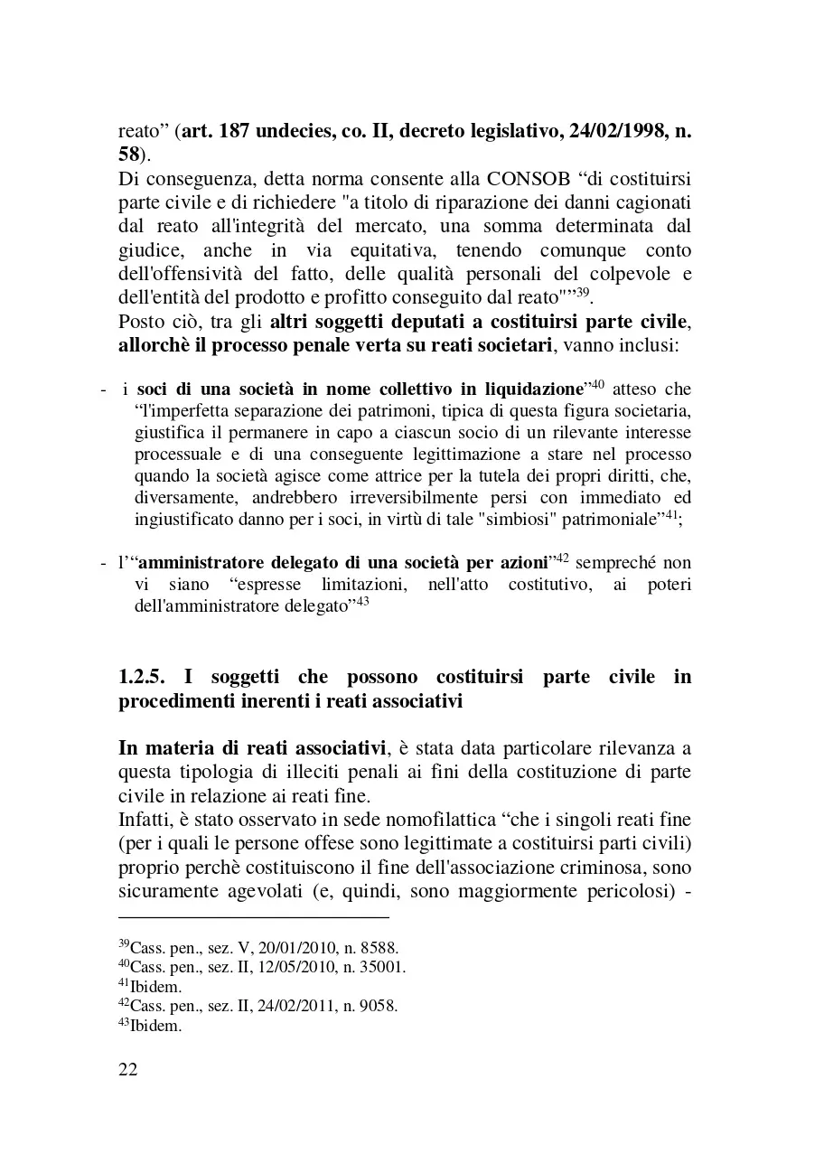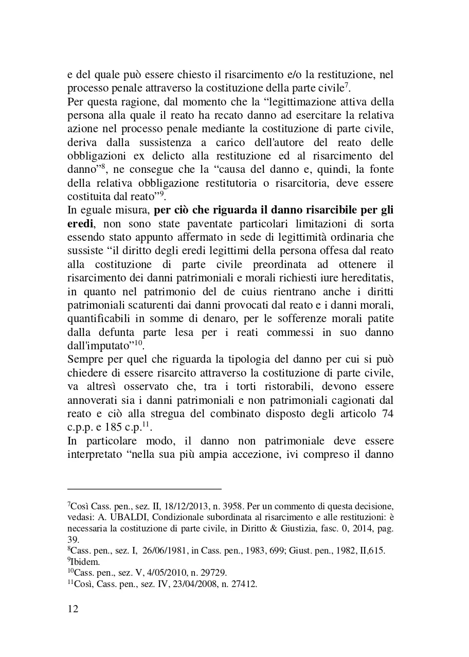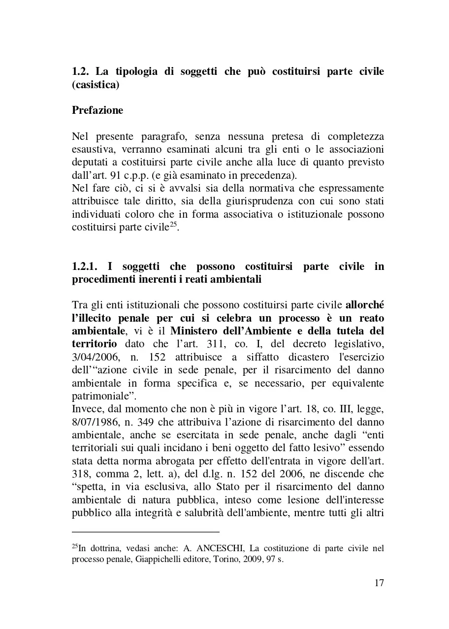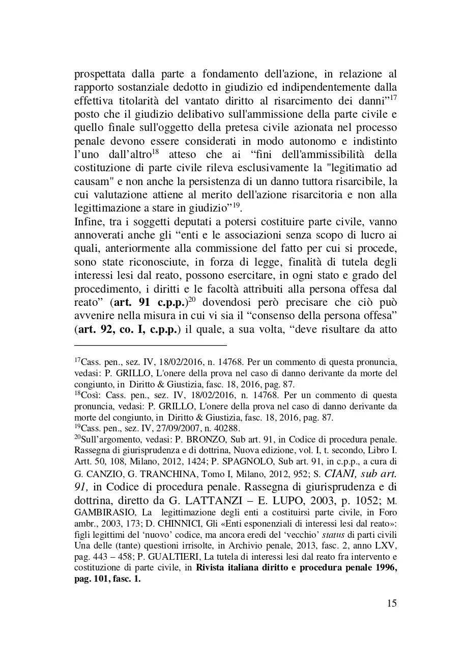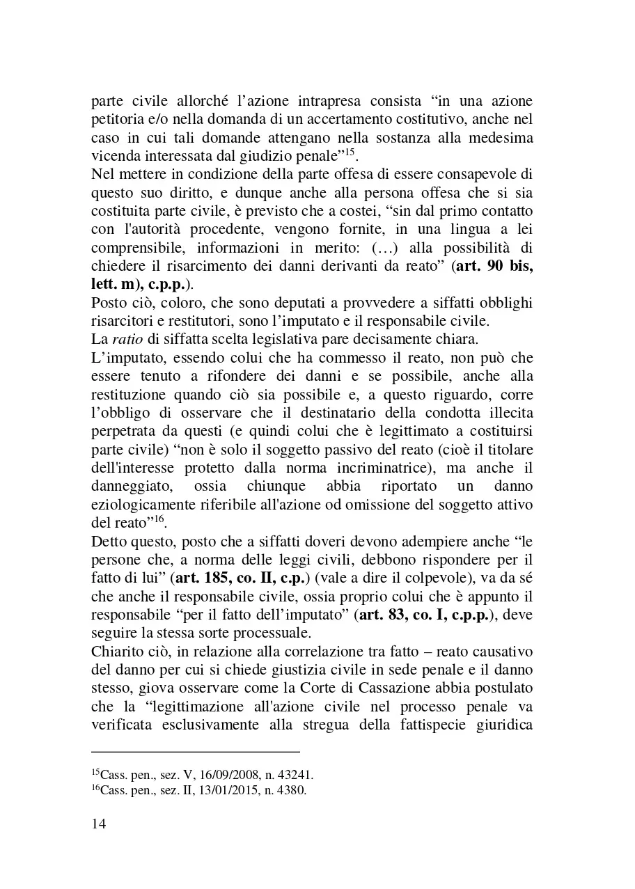 Scopo del presente libro è quello di esaminare il ruolo della parte civile nel processo penale. Il metodo adottato a tale scopo è stato quello di esaminare il ruolo di questo soggetto processuale analizzando: a) le norme del codice di rito e quelle di attuazione che lo riguardano (e segnatamente in ordine ai diritti e le facoltà che queste disposizioni legislative gli riconoscono); b) le altre norme (o meglio le più rilevanti tra di esse) che l'ordinamento giuridico extraprocessuale dispone per siffatta figura giuridica. Nel fare ciò, ci si è avvalsi anche della giurisprudenza con cui i giudici (soprattutto di legittimità ) hanno chiarito il modo in cui dette statuizioni di legge devono essere applicate. Il lavoro che si è inteso fare, quindi, è stato quello di provare a mettere in evidenza il ruolo della vittima in questo processo al fine di chiarirne come ed in che termini essa può partecipare in questo iter processuale.