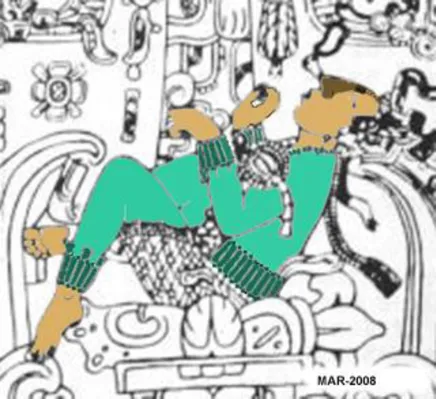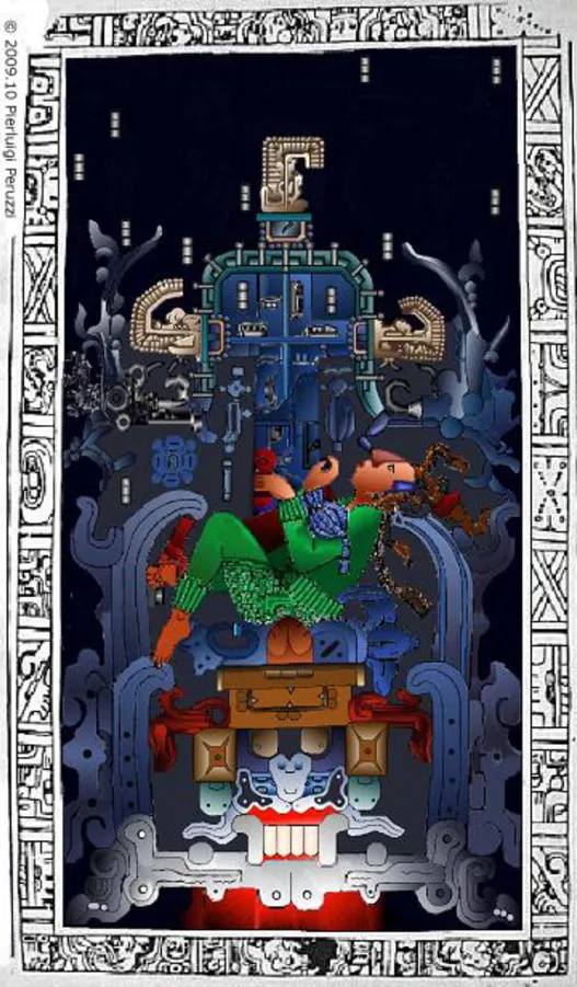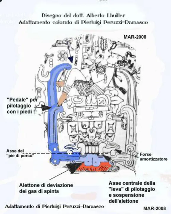 Se si vuol capire che cosa ci vuol dire l'immagine sulla tomba di Palenque, allora bisogna guardarla dal lato tecnico. Grazie al buon disegno del dott. Lhuiller e la mia colorazione si può spiegare il tutto un po’ meglio.