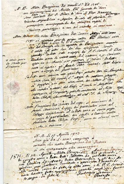 Dunque le prime grandi Porte trasversali alle strade appaiono nel 1791 come una novità mai vista, e difatti l’anno successivo lo stesso don Ambrogio scrive in un altro appunto che alcuni rappresentanti della comunità avevano proposto a fra’ Antonio Maria Baroffio di lasciar esporre le Porte trionfali da lui custodite presso la chiesa di San Giovanni anche per la consueta Processione del Corpus Domini, ma “ebbe il coraggio di dare una [risposta] negativa, dicendo, che erano unicamente adatte per l’illuminazione di notte”. Probabilmente il successo dei nuovi allestimenti era stato grande e immediato, se in questo stesso anno 1792 sempre don Ambrogio appunta altre novità: “Nella processione del 1792 si fecero [nell’itinerario delle Processioni] le seguenti varianti (…), sotto lo specioso pretesto che vi erano tanti fanali illuminati, che non si godevano nel venire da San Giovanni (…); si compì il numero dei fanali illuminati [in questo caso le 10 Porte], a spese però dei particolari”.