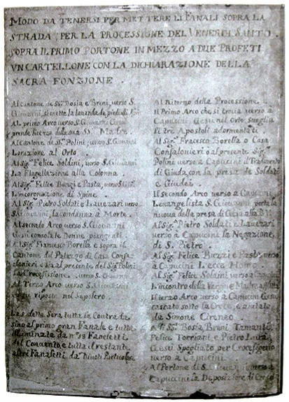 Questi documenti trovano riscontro nelle firme apposte sui telai originali di alcuni Trasparenti, in particolare quelli appesi sulla facciata del convento e della chiesa di San Giovanni, dove leggiamo “Giovanni Battista Bagutti” e le due date del 1791 e 1792. Purtroppo è andato perduto uno dei documenti più importanti, di cui si conserva ora solo la fotografia fatta nel 1992. Si tratta di un elenco che indica i soggetti e la disposizione delle originali prime 10 Porte, con i nomi dei proprietari delle case a cui erano ancorati. Considerando le trasformazioni urbanistiche intervenute e la difficoltà di identificare con certezza l’ubicazione della casa di ciascun proprietario, si possono solo avanzare ipotesi sulla collocazione di questa prima serie di Fanali illuminati.
