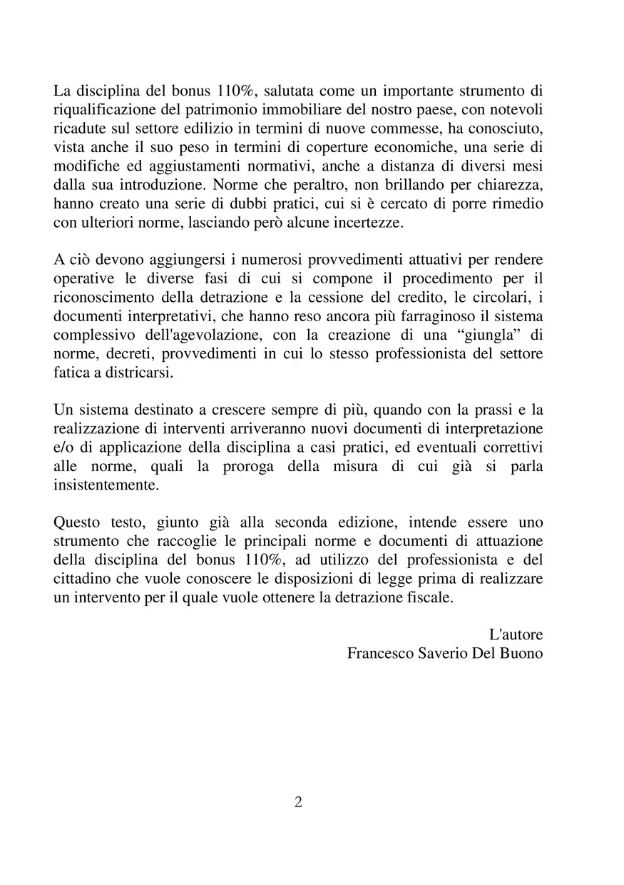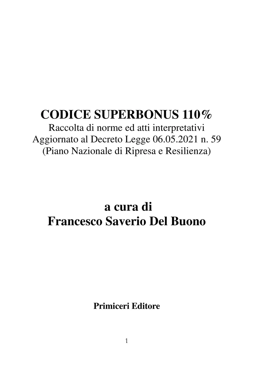 Il presente volume raccoglie le principali norme e documenti di attuazione della disciplina del bonus 110%, ad utilizzo del professionista e del cittadino che vuole conoscere le disposizioni di legge prima di realizzare un intervento per il quale voglia ottenere la detrazione fiscale. Edizione 2021 aggiornata al Decreto Legge 06.05.2021 n.59 (Piano Nazionale di Ripresa e Resilienza).