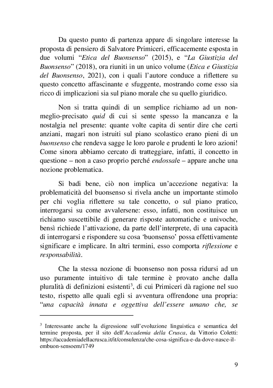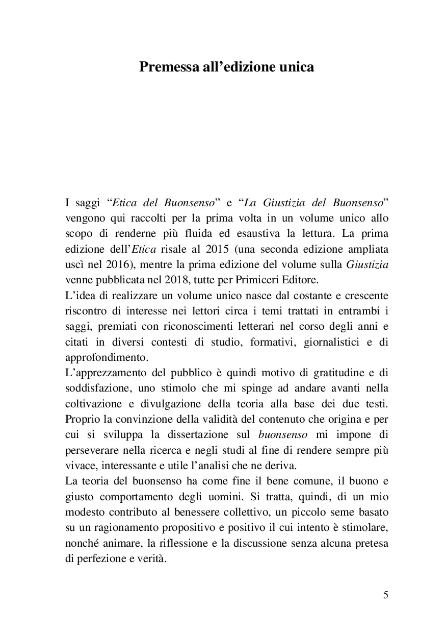I premiati saggi "Etica del Buonsenso" e "La Giustizia del Buonsenso" vengono qui raccolti per la prima volta in un volume unico allo scopo di renderne più fluida ed esaustiva la lettura. L'autore indaga il significato di "buonsenso" e riflette su come esso vada inteso e applicato nella pratica, avvalendosi di numerosi riferimenti filosofici. La "teoria del buonsenso" che ne scaturisce, ha come fine il bene comune, il buono e giusto comportamento degli uomini, e per questo i campi di azione sono necessariamente l'etica e la giustizia. Questa edizione si presenta completamente riveduta, corretta e integrata in varie parti con l'aggiunta di tre capitoli inediti. Inoltre, si correda del prezioso saggio introduttivo di Federico Reggio dell'Università di Padova.
