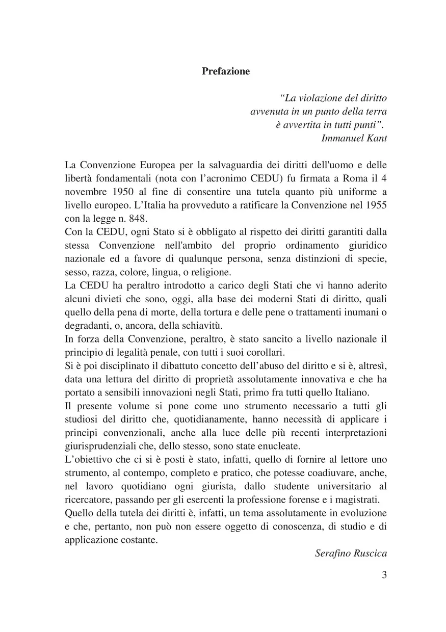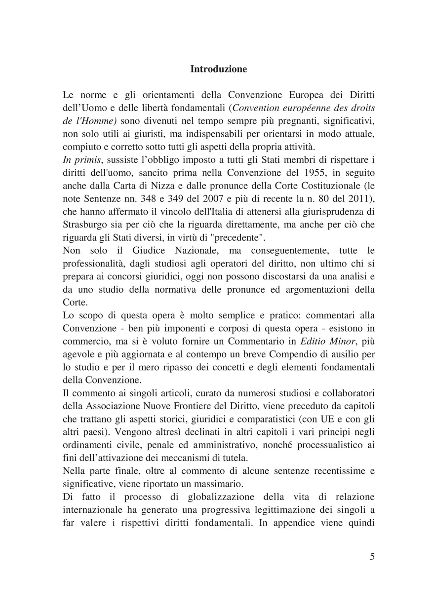 Le norme e gli orientamenti della Convenzione Europea dei Diritti dell'Uomo e delle libertà fondamentali (Convention européenne des droits de l'Homme) sono divenuti nel tempo sempre più pregnanti, significativi, non solo utili ai giuristi, ma indispensabili per orientarsi in modo attuale, compiuto e corretto sotto tutti gli aspetti della propria attività. Il presente volume ne offre una lettura e approfondimento agevole e pratico. Il commento ai singoli articoli, curato da numerosi studiosi e collaboratori della Associazione Nuove Frontiere del Diritto, viene preceduto da capitoli che trattano gli aspetti storici, giuridici e comparatistici (con UE e con gli altri paesi). Vengono altresì declinati in altri capitoli i vari principi negli ordinamenti civile, penale ed amministrativo, nonché processualistico ai fini dell'attivazione dei meccanismi di tutela. Nella parte finale, oltre al commento di alcune sentenze recentissime e significative, viene riportato un massimario.