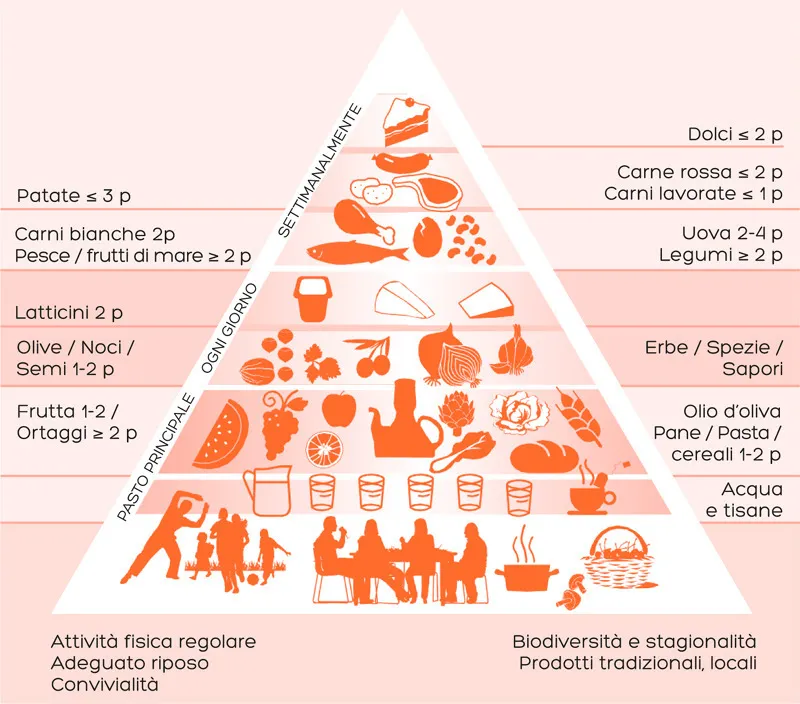 Ecco la piramide che la Fundación Dieta Mediterránea ha elaborato per l’Italia, tenendo conto dello stile di vita odierno. Si riferisce a una popolazione adulta – per bambini e anziani sarebbero necessari diversi adattamenti.