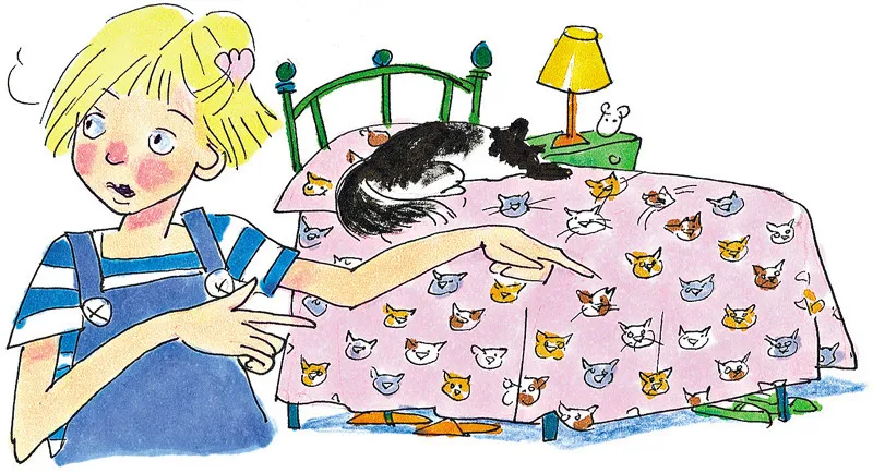 «Sotto il letto, presto!» gli ho detto. Per fortuna il mio è un letto vecchio stile, in ferro battuto, e sotto c’è un sacco di spazio. Inoltre ha un copriletto rosa a gattini che arriva fino a terra, quindi è un nascondiglio perfetto. Infatti ci tengo tutti i miei segreti, oltre alle scatole con le scarpe che non puzzano. Quelle che puzzano, tipo quelle da ginnastica e i moon boot, sono sul balcone.