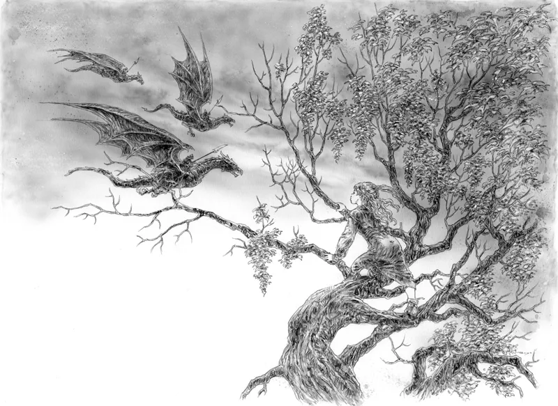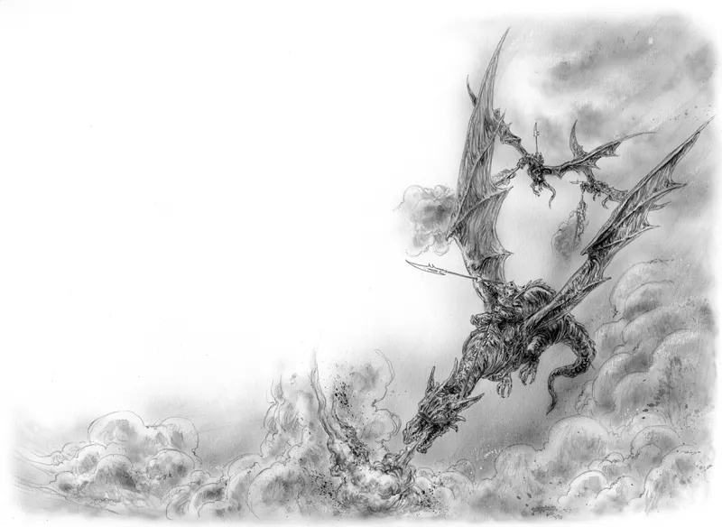 Non aveva mai visto animali simili. Le loro scaglie erano scure e fuligginose, non verdi come quelle del drago di Hal. Un drago era tinta ruggine, un altro colore del sangue secco e un altro ancora nero come il carbone. Tutti avevano occhi che sembravano tizzoni ardenti, dalle narici fuoriusciva del vapore e le code guizzavano avanti e indietro mentre le ali scure e coriacee battevano l’aria.