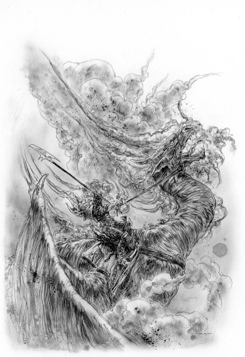 Anche quello nero emise un suono, e quando spalancò le mascelle uscì una colonna di fuoco, arancione e blu, che lambì gli alberi sottostanti. Le foglie avvizzirono e annerirono, cominciò a salire del fumo là dove era arrivato il respiro del drago.