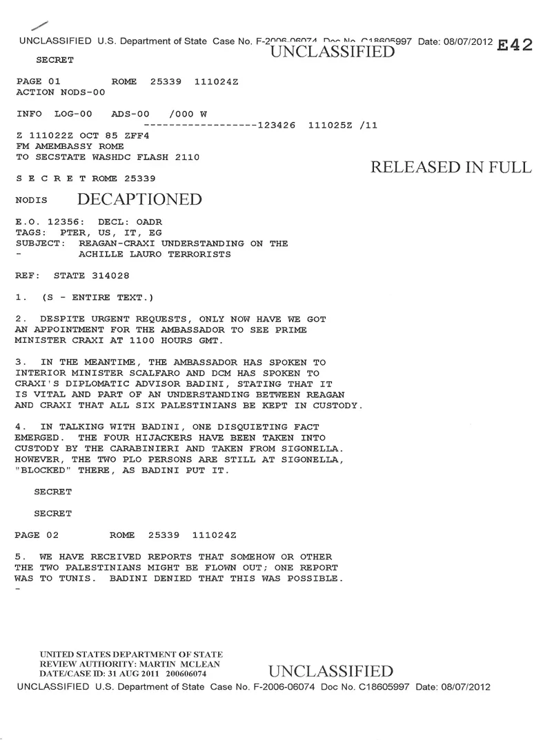 Oggetto: Intesa Reagan-Craxi sui terroristi dell’Achille Lauro