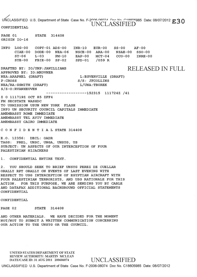 L’11 ottobre il segretario di Stato G. Shultz invia questa comunicazione a Vernon Walters, allora ambasciatore americano presso le Nazioni Unite, orientando quelle che dovevano essere le strategie diplomatiche da mettere in campo nel Consiglio al fine di evitare il più possibile ripercussioni politiche a seguito del dirottamento.