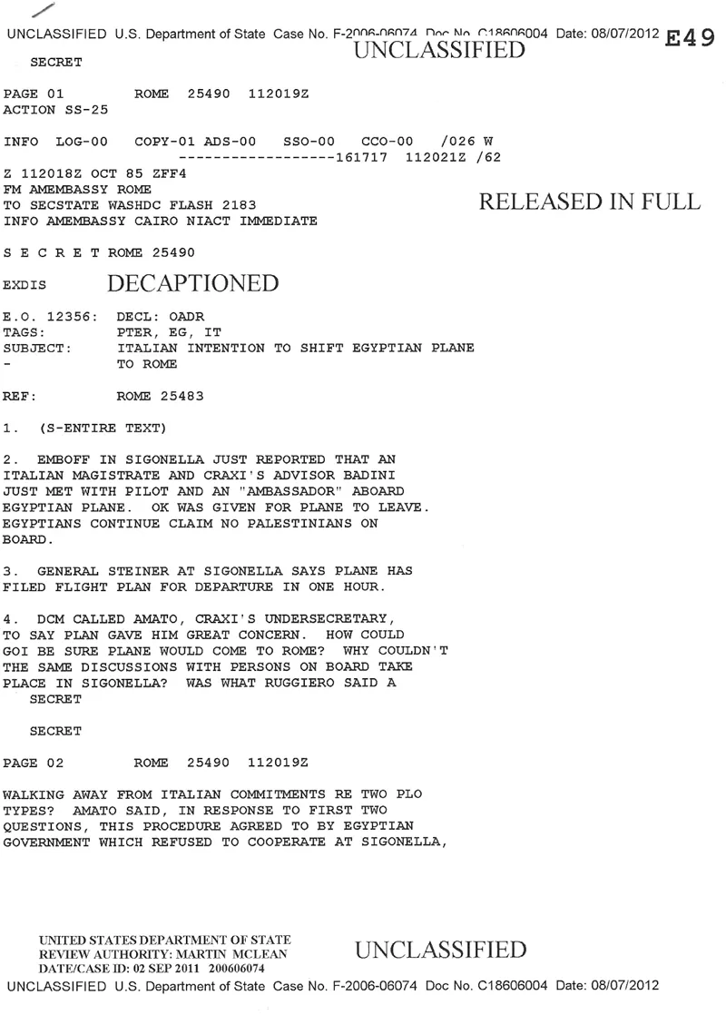 Il documento, frutto di una comunicazione dell’ambasciatore americano a Roma, M. Rabb, al Dipartimento di Stato, sottolinea quanto l’«understanding», l’intesa, tra Reagan e Craxi durante le tre telefonate intercorse nella notte del dirottamento, sia stata piuttosto inizialmente un «misunderstanding», un fraintendimento, delle intenzioni dei due Paesi. La questione dei «quattro e dei due» emerge qui con grande enfasi, assieme alla necessità della loro identificazione.