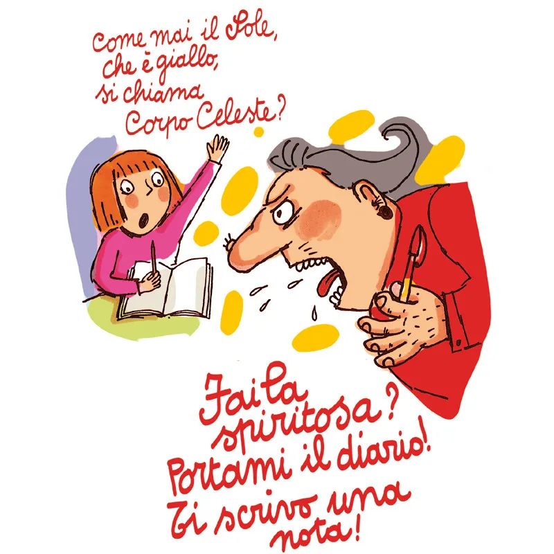La maestra Clarissa è molto bella e anche molto buona, mentre la maestra Ermentruda è brutta come il suo nome: ha i capelli grigi, i baffi che pungono quando ti bacia (ma non ti bacia quasi mai), le gambe grosse e pelose e i piedi piatti, enormi. Come se non bastasse, è severissima. Guai se chiacchieri col tuo vicino di banco, guai se ti cade l’astuccio, guai se fai le orecchie sui fogli del quaderno, guai se mastichi gomma americana o pasticci con i pennarelli sul libro di lettura…