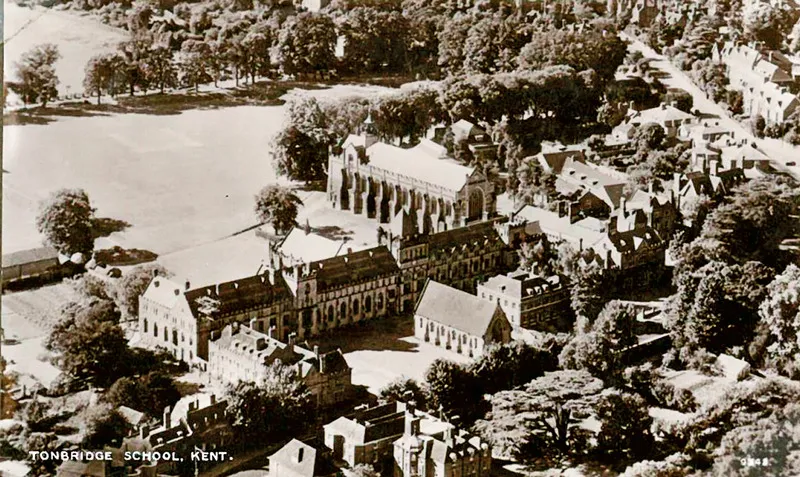 La scuola di Tonbridge (a sinistra e sotto) non era uno spasso: questo è il raduno di fine anno del 1952 nella Big School. Io tenni duro fino al dicembre del 1955. Se non altro, ebbi la soddisfazione di dirle addio dal posto di pilotaggio di un Tiger Moth.