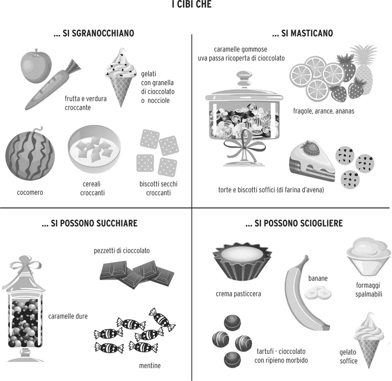 Nel 2001 l’azienda alimentare McCormick, una società americana che produce spezie e additivi alimentari, commissionò una ricerca sul gusto degli americani. I risultati? In cima alle preferenze degli uomini c’erano carne e costine cotte sul barbecue, mentre le donne erano più attratte da cioccolatini e gelati. La ricerca confermò che la maggior parte delle persone è facilmente condizionabile dagli aromi artificiali in grado di rendere irresistibile qualunque prodotto. E che un ruolo fondamentale lo giocano il marketing (gli aggettivi usati per descrivere un alimento, per esempio: croccante, soffice, succulento, saporito e così via) e gli abbinamenti (gelato con succo di amarena e noccioline, patate al gusto di pancetta, rosmarino con crema di formaggio ecc.). A condizionare le nostre scelte, infine, sembra incredibile ma interviene anche il mouth behavior, cioè il comportamento della bocca.3 E voi che tipi siete? Più sgranocchiatori o più «amanti del soffice»?