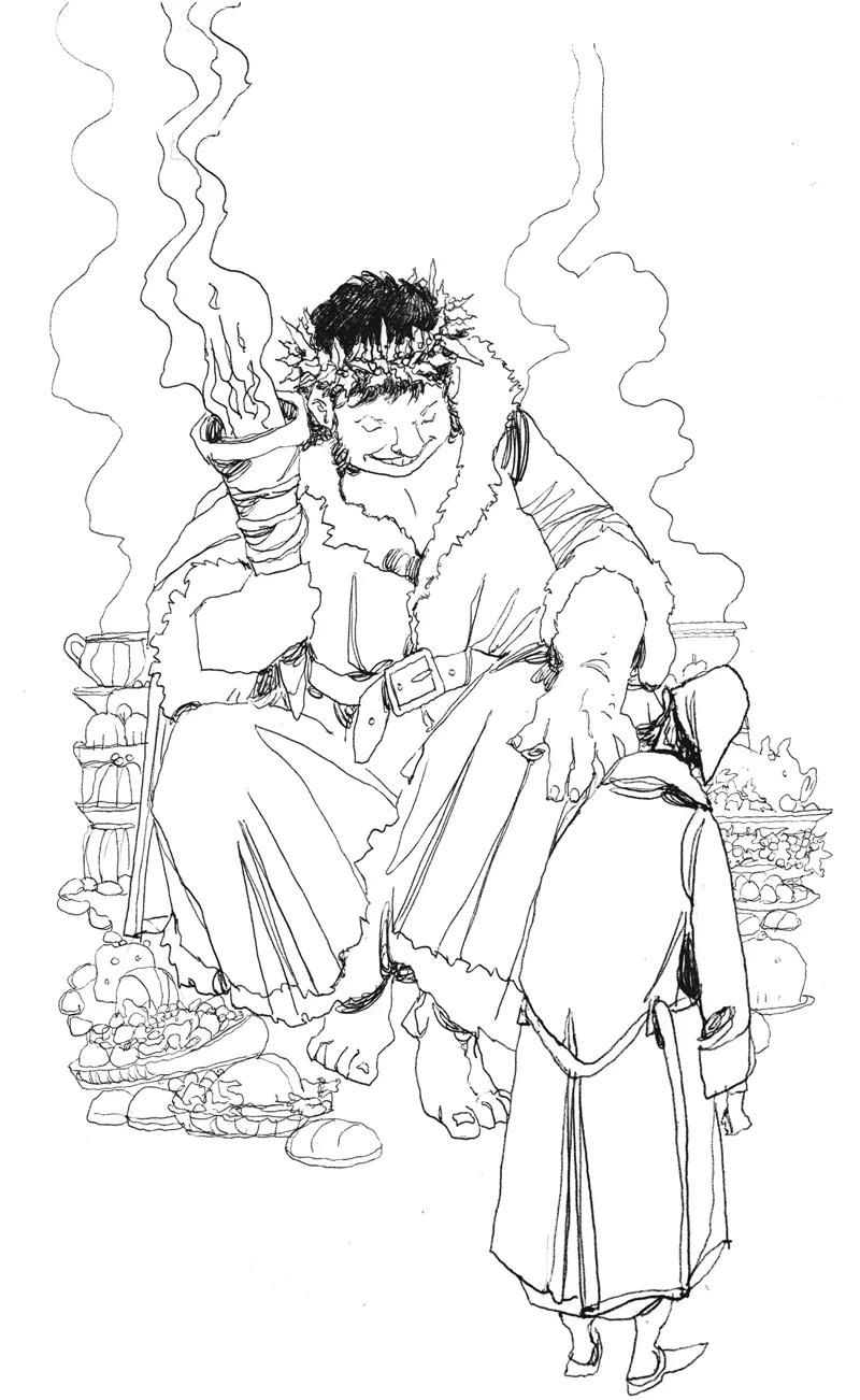 Il vecchio si affrettò a ubbidire, e vide che lo spettro era avvolto in una sorta di mantello verde scuro bordato di pelliccia bianca, gettato sulle spalle con tanta noncuranza da lasciargli scoperto il petto. Era a piedi nudi e aveva in testa una corona di agrifoglio, ornata da ghiaccioli luminosi. I lunghi riccioli scuri gli ricadevano sulla fronte, liberi come il suo viso simpatico, gli occhi brillanti, le mani spalancate, la voce allegra, l’atteggiamento semplice, i modi cordiali e l’aria sorridente. Appeso alla cintola aveva un fodero vecchio e arrugginito, vuoto.