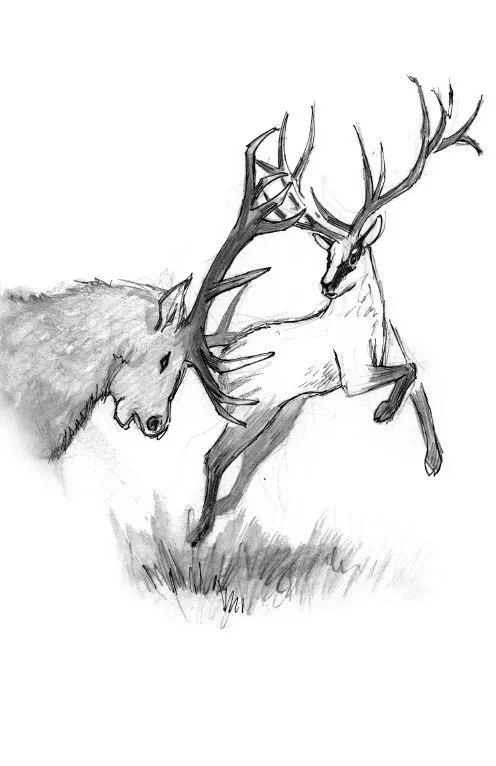 Passò l’autunno, l’inverno e venne marzo. A marzo i cervi perdono le maestose corna per mettere quelle nuove. Le lasciano cadere per terra. All’improvviso i trofei si staccano e cadono come certi rami secchi dagli alberi. I cervi continuano a brucare o camminare senza nemmeno farci caso. Anzi, sembrano contenti di essersi finalmente liberati da quel peso. Un giorno il camoscino traversa un prato e vede, nell’erba secca appiattita dalla neve appena scomparsa, un enorme paio di corna. Le aveva lasciate cadere un cervo poco prima. Svelto vi si china sopra e le prova, sognando che gli restino attaccate. Uno spirito dei boschi, saggio e severo, lo vede e con una magia fa sparire le sue corna e gli attacca quelle del cervo.