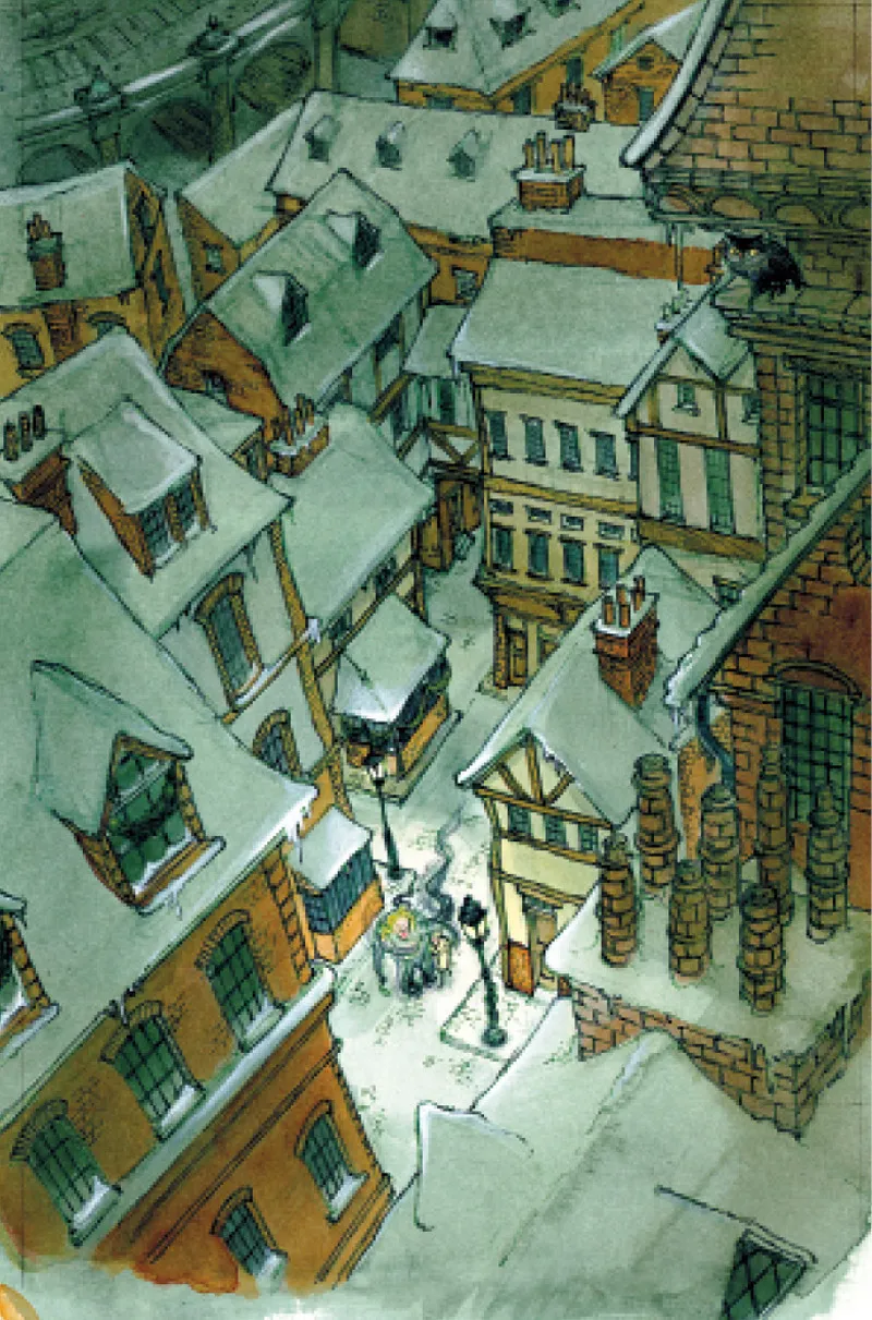 L’agrifoglio, il vischio, le bacche rosse, l’edera, i tacchini, le oche, la selvaggina, il pollame, i cosciotti, la carne, i porcellini, le salsicce, le ostriche, i pasticci, i pudding, la frutta e il punch, tutto svanì immediatamente e così pure la stanza, il fuoco, il chiarore rossastro, l’ora notturna. Si trovarono nelle vie della città , una mattina di Natale; e, poiché la temperatura era rigida, la gente faceva una specie di musica rude ma vivace e non del tutto sgradevole grattando via la neve dai marciapiedi dinanzi alle case e dai tetti, con gran divertimento dei bambini che stavano a guardarla cader giù nella strada sottostante e sparpagliarsi in tante piccole nevicate artificiali.
