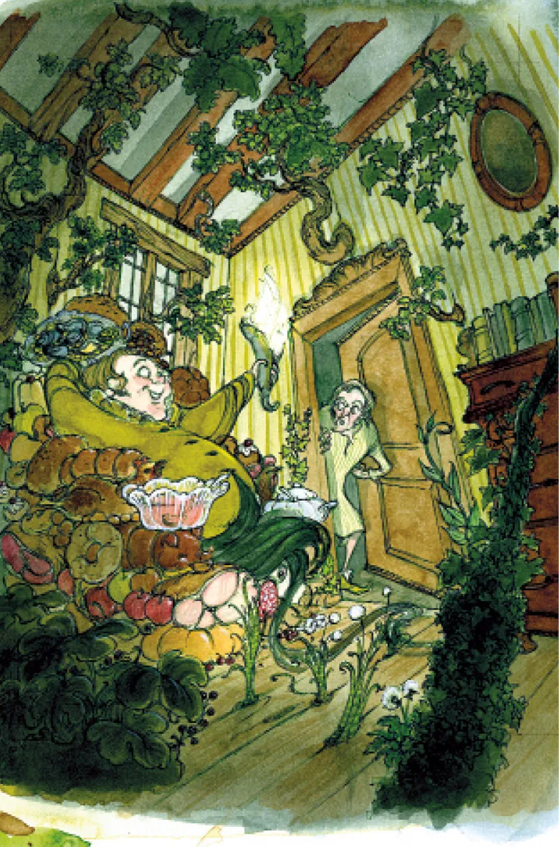 Era proprio la sua stanza, non c’era dubbio, ma aveva subito una trasformazione sorprendente. Le pareti e il soffitto erano talmente coperti di verde vivente, da farli sembrare come una vera e propria spalliera, da ogni punto della quale luccicavano bacche lucenti. Le foglie dell’agrifoglio, del vischio e dell’edera riflettevano la luce come tanti piccoli specchi e nel caminetto ardeva un fuoco così potente, come quella triste pietrificazione di un focolare non aveva mai conosciuto ai tempi di Scrooge e Marley né per molti e molti inverni passati. Ammucchiati sul pavimento, in modo da formare una specie di trono, erano tacchini, oche, selvaggina, pollame, cosciotti muscolosi, grandi pezzi di carne, porcellini di latte, lunghe collane di salsicce, pasticci di carne, pudding, barilotti di ostriche, castagne arrosto roventi, mele dalle guance di ciliegie, arance succose, pere succulente, torte smisurate e ciotole fumanti di punch, che annebbiavano la stanza col loro vapore delizioso. Seduto comodamente su questo giaciglio era un allegro gigante, magnifico a vedere, il quale teneva in mano una torcia ardente di forma simile a quella di una cornucopia e la teneva alta, molto alta, in modo da farne cadere la luce su Scrooge, nel momento in cui questi si affacciò alla porta per dare un’occhiata intorno.
