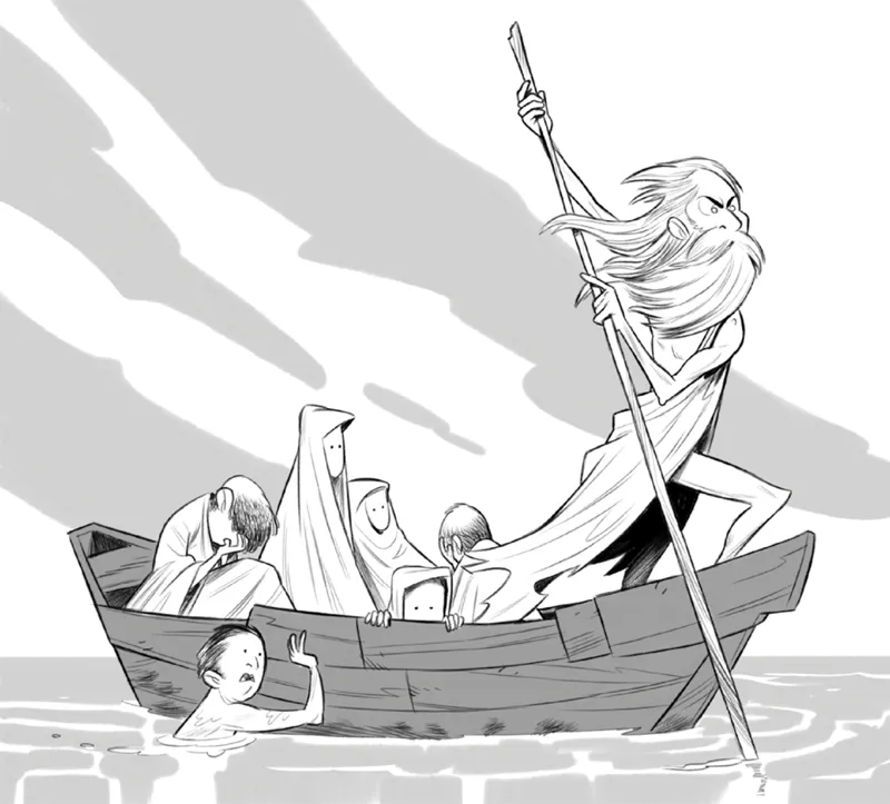 Dante e Virgilio avanzano e si trovano sulla riva del fiume Acheronte, dove sono assiepate le anime dei dannati. Dall’acqua arriva il demone Caronte (“Caron dimonio, con occhi di bragia”!), il traghettatore di anime, con la sua barca a remi.