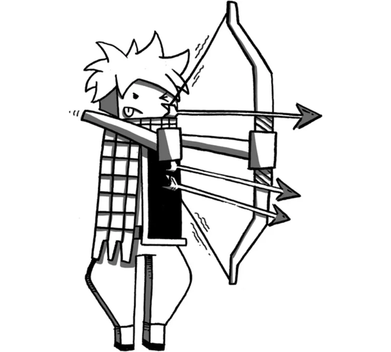 D’un tratto una gigantesca meteora sfrecciò proprio nella sua direzione. Preso di sorpresa, lo avrebbe senza dubbio colpito, ma Stefano riuscì a spaccarla scoccando tre frecce con il suo nuovo arco.