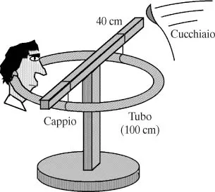 Ai lettori interessati alla sperimentazione, suggerisco di ascoltare un impianto stereo con entrambe le orecchie e poi chiudendone una. Se poi desiderano fare qualcosa di più sistematico, possono operare nel modo suggerito dalla figura III.1.2. Occorrono un tubo flessibile del tipo per cavi elettrici sottotraccia, due assicelle di legno, un piedistallo. Il tubo è appeso con due cappi di filo metallico all’asticella orizzontale. Se quest’ultima viene percossa con un cucchiaio in successivi punti tra i due estremi, variano le lunghezze dei due cammini acustici e il suono migra da un orecchio all’altro dello sperimentatore.