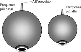 Nel secolo scorso il tedesco Hermann von Helmholtz, geniale studioso di problemi della percezione, inventò dei risonatori di vetro a forma di boccia — si veda la figura III.2.1 — basati sull’identico principio della conchiglia: con essi fece l’analisi delle varie armoniche che costituiscono un suono complesso, com’è una nota emessa da uno strumento. Il beccuccio del risonatore viene appoggiato all’orecchio e l’apertura maggiore è rivolta verso la sorgente sonora. Il suono si rafforza selettivamente per quella frequenza — e quella soltanto — che coincide con quella di risonanza della sfera prescelta (qui condizionata dal suo raggio). Più grande è il raggio, più bassa la frequenza di risonanza. Sullo stesso principio si fondano naturalmente le casse armoniche degli strumenti musicali, solo che in quel caso, allo scopo di riprodurre bene tutte le note del tessuto musicale, la forma è varia e sinuosa e le frequenze di risonanza sono moltissime.1 Helmholtz usò appunto i suoi risonatori per analizzare le frequenze contenute nelle voci e nelle note degli strumenti musicali, ossia per ricavare degli approssimativi spettri di frequenza.