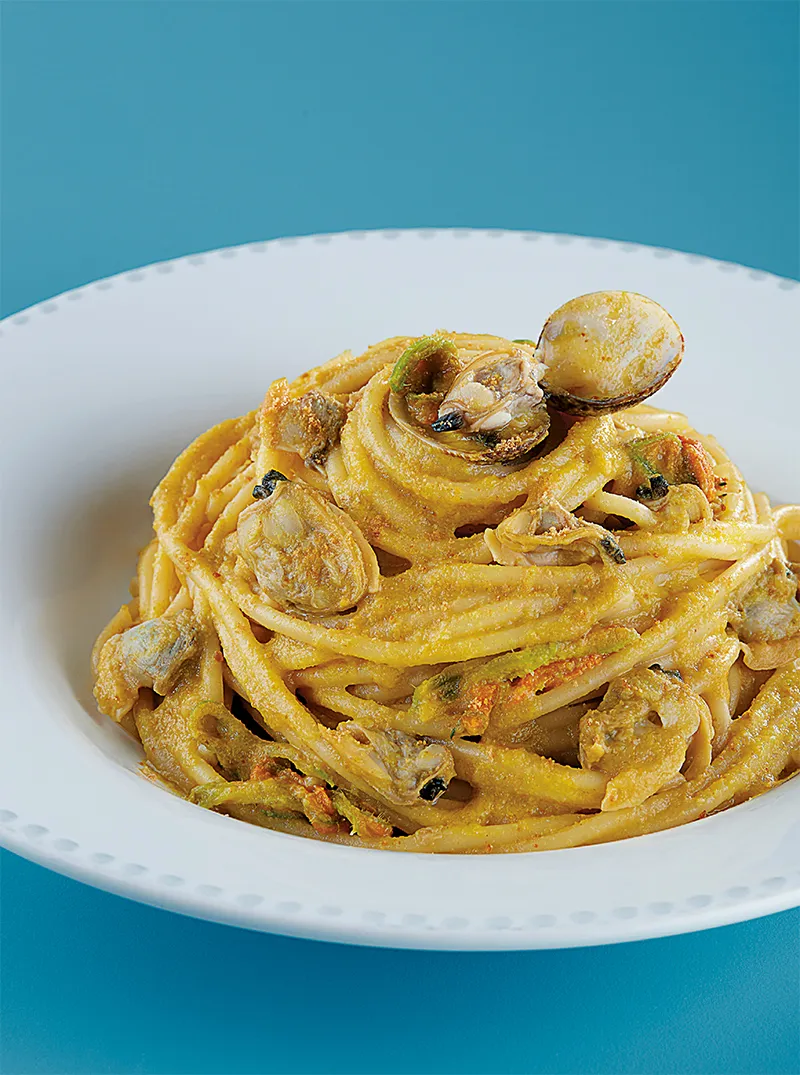 SPAGHETTI ALLA CREMA DI FIORI DI ZUCCA CON VONGOLE E BOTTARGA