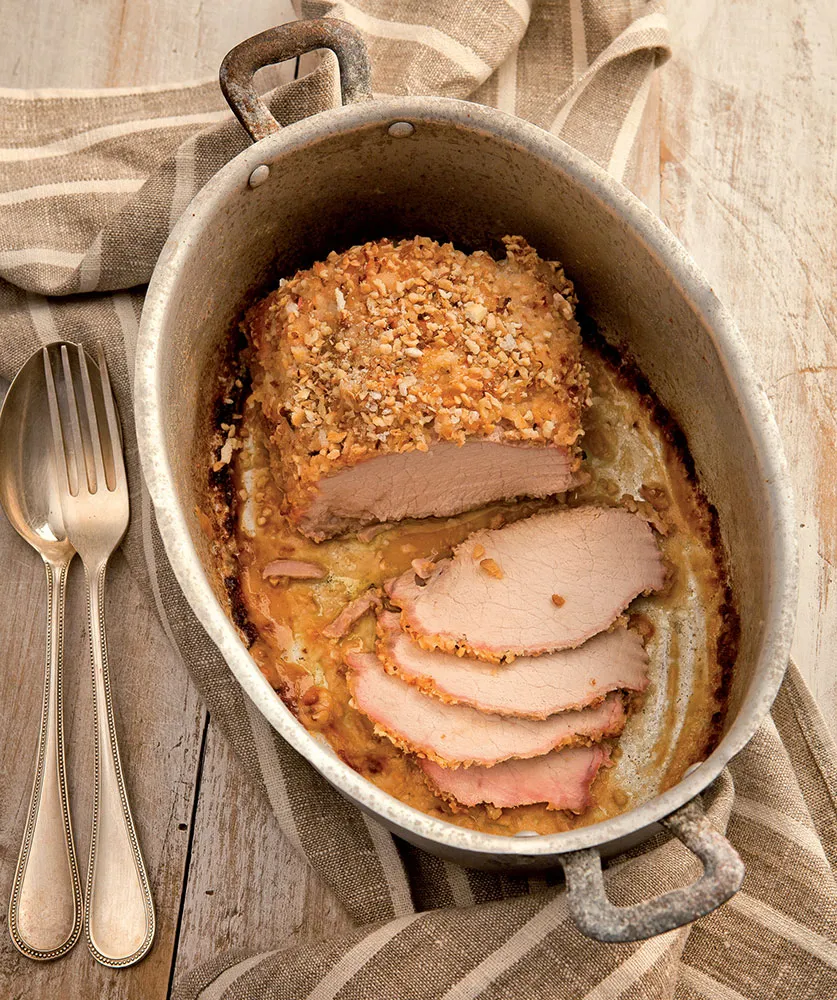 Ingredienti per 4 persone: 50 g di frutta secca mista (noci, nocciole, mandorle, pistacchi ecc.) • 15 g di grana grattugiato • 15 g di pangrattato • 1 uovo • 800 g di arista di maiale • olio extravergine • sale • pepe