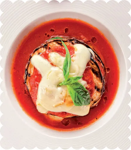•Assemblare una parmigiana per ogni commensale alternando una fetta di melanzana, sugo di pomodoro, una fetta di seitan, scamorza e basilico fino a esaurire gli ingredienti.