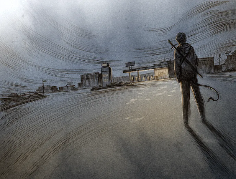 Cardan si è trovato pochissime volte a girare da solo per il mondo dei mortali. Quel paesaggio così diverso lo affascina. Davanti a lui, la strada. Sabbia, detriti e pietrisco amalgamati da bitume puzzolente. Passa davanti a negozi di alimentari, parrucchieri, farmacie con le luci ancora accese. Tutto puzza di ferro e di marcio, ma in qualche modo ci bada sempre meno via via che si abitua a quel mondo.