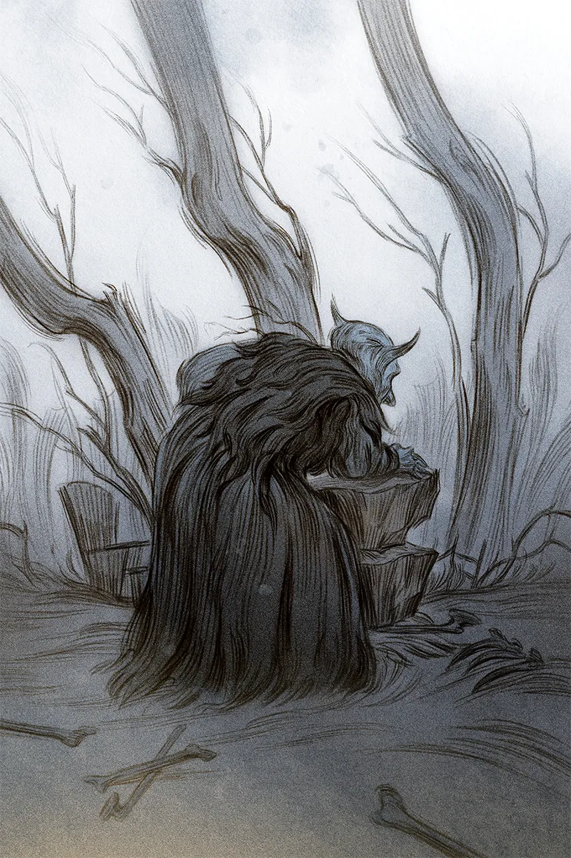 E vede Aslog curva su due pietre sovrapposte. Il suo corpo massiccio si piega mentre le fa girare una sull’altra come una macina improvvisata dalla quale esce una polvere bianca fine fine. Accanto, scorge una griglia consumata e ammaccata, come se fosse stata presa da un mucchio di immondizia. Aslog ha arredato la sua tana con delle sedie da veranda tutte arrugginite e un vecchio divano sul quale crescono funghi. E, per terra, indumenti abbandonati qua e là.