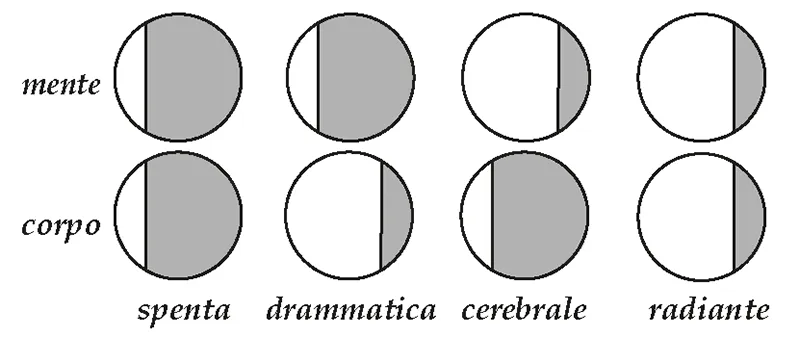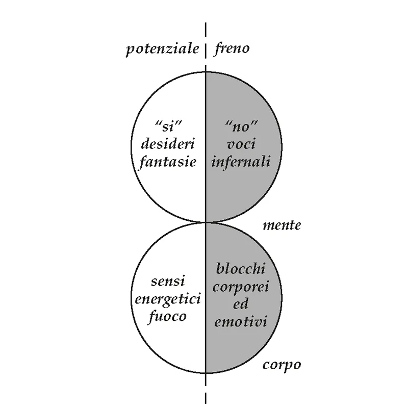 Ma non crediate che la mente, con le sue voci e le sue convinzioni, sia l’unico ostacolo a una sessualità serena. Le cose sono più complesse: a quelle voci corrispondono blocchi muscolari e blocchi emotivi. E, d’altra parte, anche il potenziale della sessualità liberata si trova sia nella mente (i desideri, le fantasie, le voci del bambino interiore) sia nel corpo (sensualità, slanci spontanei, voglia di allargarsi). Alle voci che dicono «sì» o «no» all’energia sessuale, si aggiungono le forze dei sensi che tendono ad allargarla, e dei blocchi che tendono a comprimerla e a frenarla.