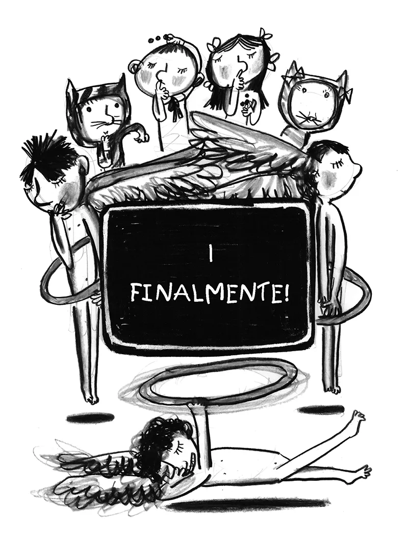 «Bene» ha detto la maestra, «parliamo per un minuto degli angeli. Siete stati mocciosi e siete stati gatti, e sapete bene di cosa si tratta. Ma gli angeli? Cos’è un angelo?» Il suo sguardo ha abbracciato tutta la classe. Si sono alzate alcune mani.