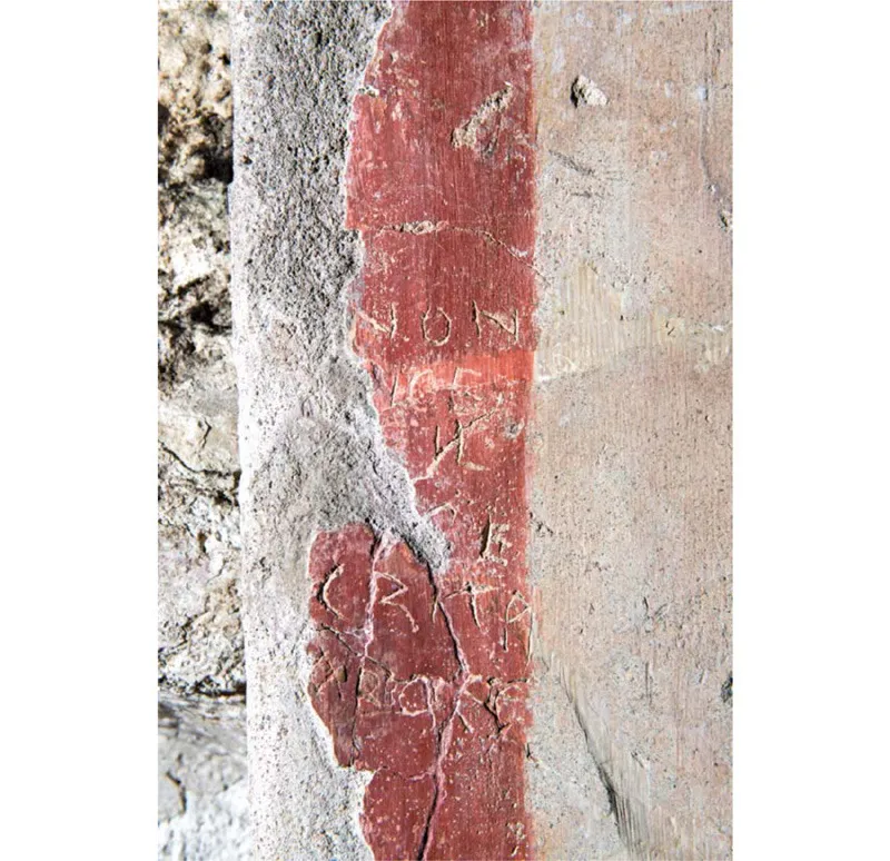 Se però ci voltiamo verso l’affresco che occupa una delle pareti, e poi volgiamo lo sguardo alla fascia rossa che lo incornicia, ci rendiamo conto che qualcuno – graffiando la pietra – ha tracciato lì una breve frase. Per riuscire a leggerla dobbiamo avvicinarci perché la scritta è piccola (11 centimetri di altezza per 6,5 di larghezza) e ormai molto rovinata. Grazie a foto scattate quando ancora era integra, possiamo dire con certezza che il testo recita: NON / DICE / RE IL / LE SE / CRITA / ABBOCE, ovvero «Non dire le cose segrete ad alta voce».