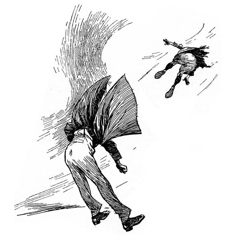 Era un uomo di bassa statura, corpulento, con due gambe esilissime, che si muoveva a scatti. Aveva creduto bene di vestire la sua figura fuori del comune con un berretto da giocatore di cricket, un soprabito, pantaloni alla zuava e calze al ginocchio, da ciclista. Non riuscii mai a capire la ragione di questo suo modo di vestire, perché non andò mai in bicicletta e non giocò mai a cricket. Si trattava di un’accozzaglia di indumenti, riuniti insieme non so come.