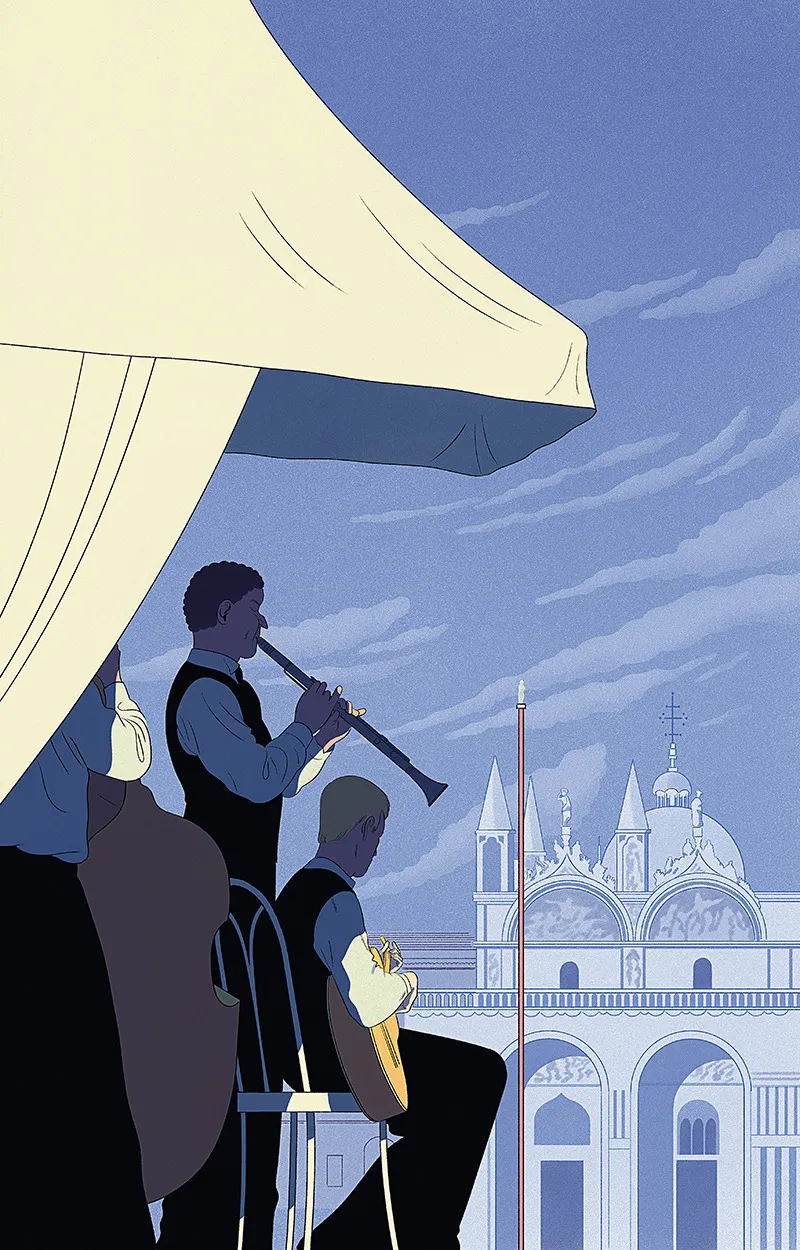 C’è poi anche il piccolo inconveniente che non sono italiano, figuriamoci veneziano. Vale pure per quel ragazzone ceco che suona il sax alto. Ci apprezzano, gli altri musicisti; e facciamo anche comodo, ma non rientriamo nei canoni ufficiali. Voi limitatevi a suonare e a tenere la bocca chiusa, ecco cosa ci dicono sempre i direttori. Cosà i turisti non si accorgono che non siete italiani. Vi presentate in giacca e cravatta, occhiali da sole e capello liscio, e nessuno vedrà la differenza, basta che non vi mettiate a parlare.