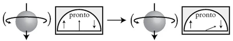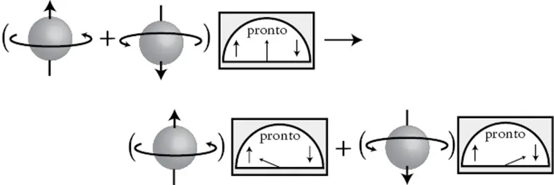 Lo stato iniziale a sinistra si può leggere come «lo spin è nello stato su e l’apparato è nello stato pronto», mentre quello a destra, in cui la lancetta indica la freccia verso l’alto, come «lo spin è nello stato su e l’apparato ha misurato che è su».