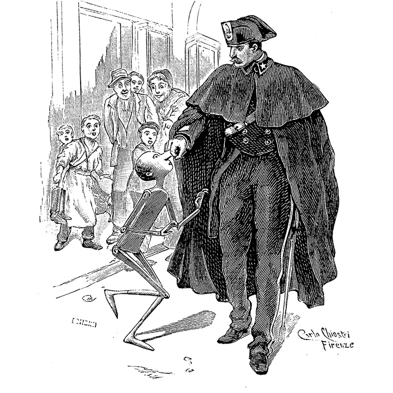 In ogni caso, dopo il prologo celeste-infernale, la vera e propria avventura di Pinocchio comincia quando il burattino, appena sgranchite le gambe intagliate da Geppetto, scappa correndo fuori di casa. Decisivo è il primo personaggio a cui l’avventura-destino lo consegna: un carabiniere, che si pianta «coraggiosamente a gambe larghe in mezzo alla strada, con l’animo risoluto di fermarlo e di impedire il caso di maggiori disgrazie». È la prima apparizione di un «tutore dell’ordine», come lo chiama il chiosatore, la «cui guitteria socializzata» tornerà piú volte a insidiare il burattino. È bene non lasciarsi sfuggire due particolari di questo fatidico incontro: il primo è che il carabiniere, come si conviene a un rappresentante della Legge, si propone di «impedire il caso»: è, cioè, nelle contingenze dell’avventura, un principio ad esse contrario. Il secondo, e ancora piú significativo dettaglio, è che il carabiniere lo «acciuffa pulitamente per il naso», un «nasone che pareva fatto apposta per essere acchiappato dai carabinieri». Il naso è uno dei temi fondamentali del libro e, come tale, era già apparso al momento della seconda creazione del burattino, quando Geppetto ha appena fatto il naso, che questo si mette a crescere «e cresci, cresci, cresci, diventò in pochi minuti un nasone che non finiva mai».